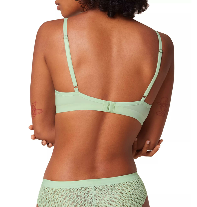 Liemenėlė Triumph pakietintais kaušeliais, su lankeliais. Liemenėlė gilia iškirpte, dekoruota tiuliu ir nėriniais. Petnešėlės reguliuojamos, nugaroje susegama trijose pozicijose.