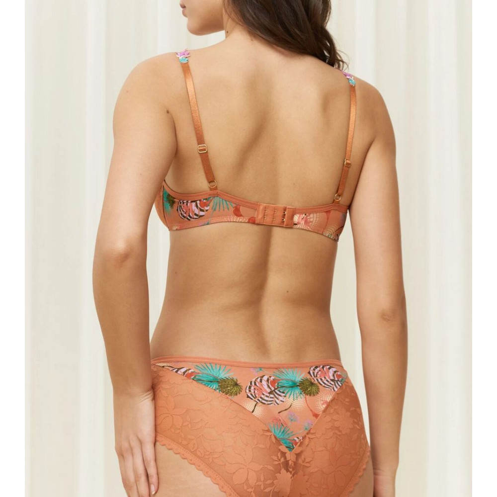 Liemenėlė be pakietinimo, su lankeliais, visa dekoruota nėriniais. Kaušelio apačioje dvigubas audinys. Reguliuojamos petnešėlės, nugaroje susegama trijomis pozicijomis, dviem kabliukais.